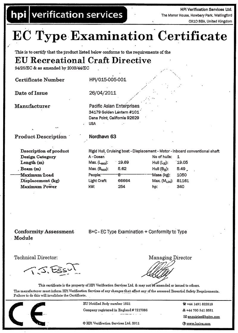 A Type Certification can be issued for production boats that do not change from boat to boat, which a builder like Nordhavn would typically do this for its smaller CE production boats. This way, only the first boat has to be inspected. Larger Nordhavns, which might change substantially from boat to boat, require individual inspections and certifications for each CE boat.