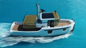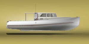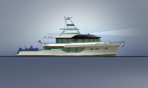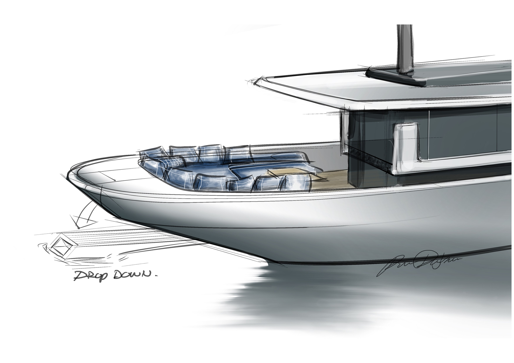 Thus, when I started this design, I tried to ignore the devil on my shoulder. I went hard full rudder and tried to look at it from the other side. Silence and serenity are the key drivers for this concept, with minimalist styling and an adjusted underwater shape to let her cruise at 20 knots. I kept the plumb bow and purposeful pilothouse, giving her the classic fantail profile.