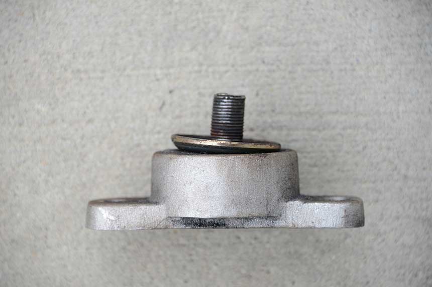 The vertical stud in the center of the mount has adjustable nuts that provide for engine alignment. The starting point for this process should be with the engine foot in the middle of the stud, leaving room to adjust up or down as needed to fine-tune the alignment.