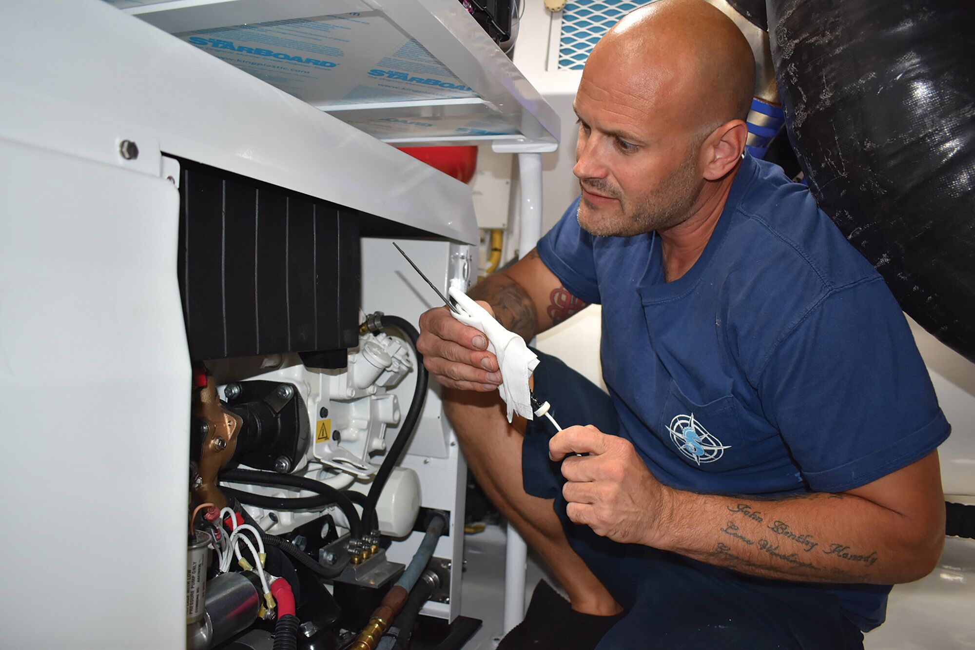 Or do yourself a favor and install a genset. A 5-kW model will charge the batteries and power a 12-volt Seakeeper, even when the engines are shut down and you’re drift-fishing. And there’s the upside of powering the A/C, or firing up the electric grill to sacrifice some burgers for lunch. (Boats from about 40 feet up use 120-volt Seakeepers. The Seakeeper 6, the smallest AC model, draws up to 2.3 kW if the seas are rough.)