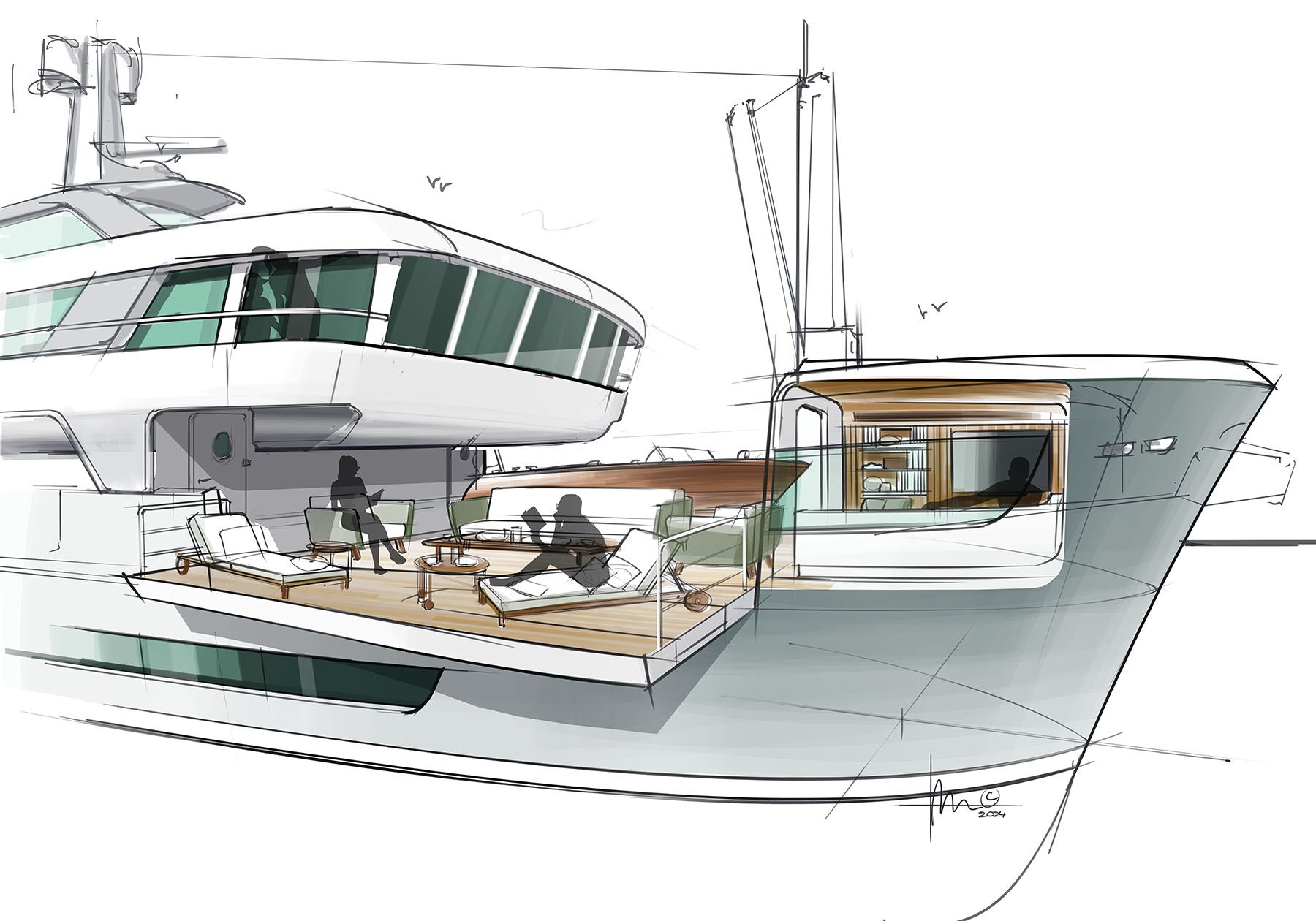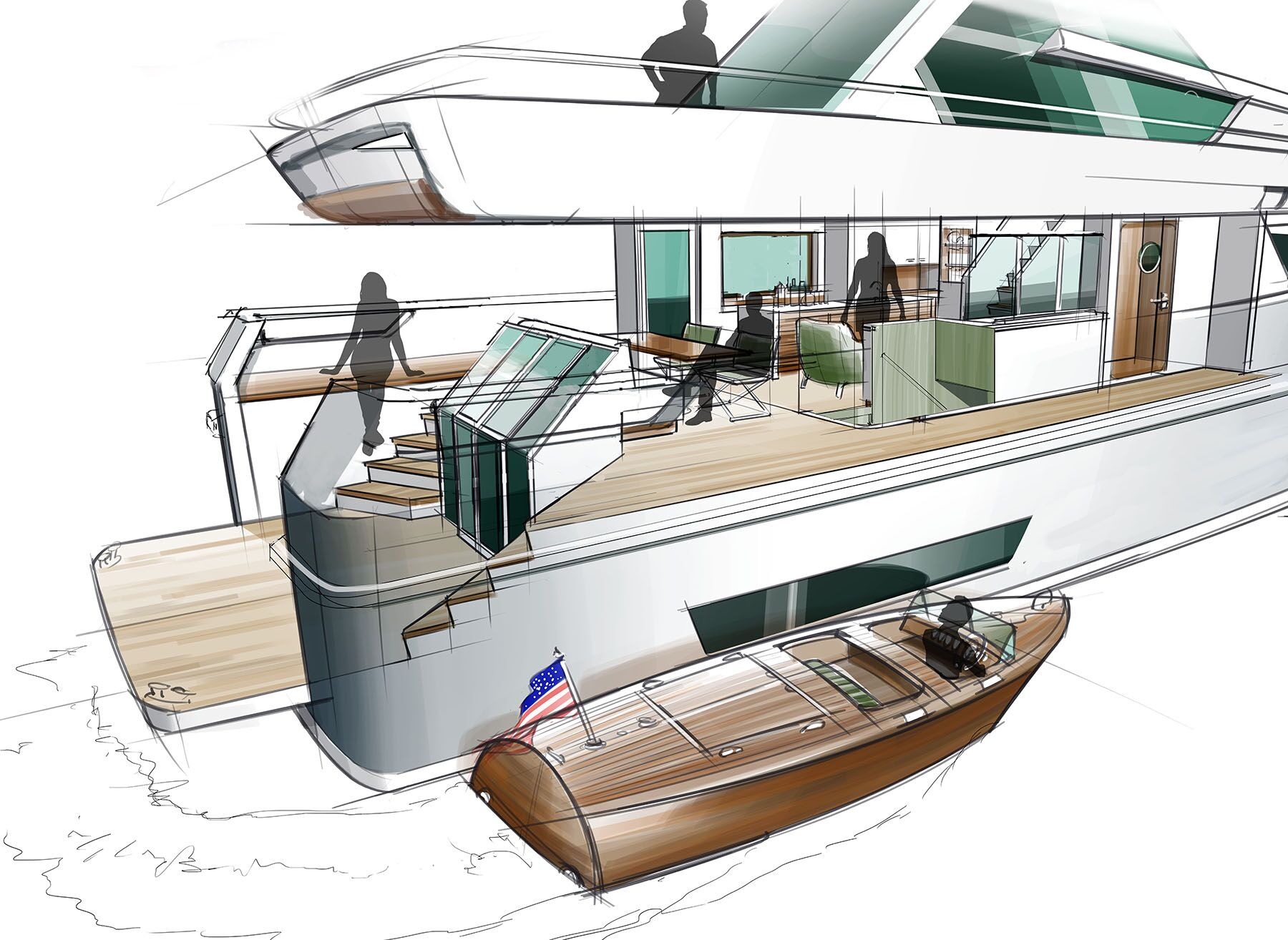 Handmade VisualsOur cockpit is meant to serve a myriad of functions: sun lounging, swimming, snorkeling, diving and more. The transom gate will drop to create a beach club, which is rimmed by lockers for stand-up paddleboards, kayaks, dive gear and deck furniture. Shielded by the after section of the flybridge, a bar and dining space is made even more functional with a drop-down transom to starboard. It’s the ideal spot for easy egress to her tender. We want this space to have true four-season functionality, so we would add both isinglass enclosures and infrared heaters.