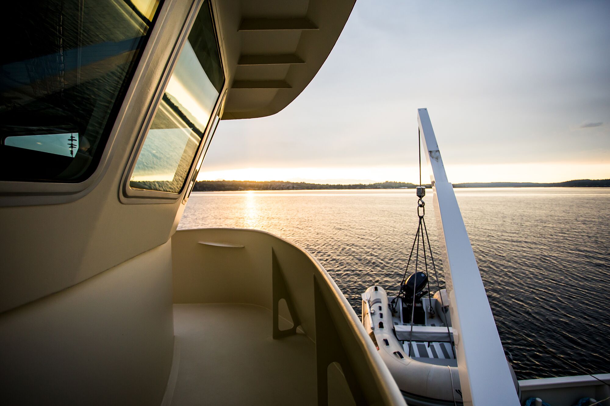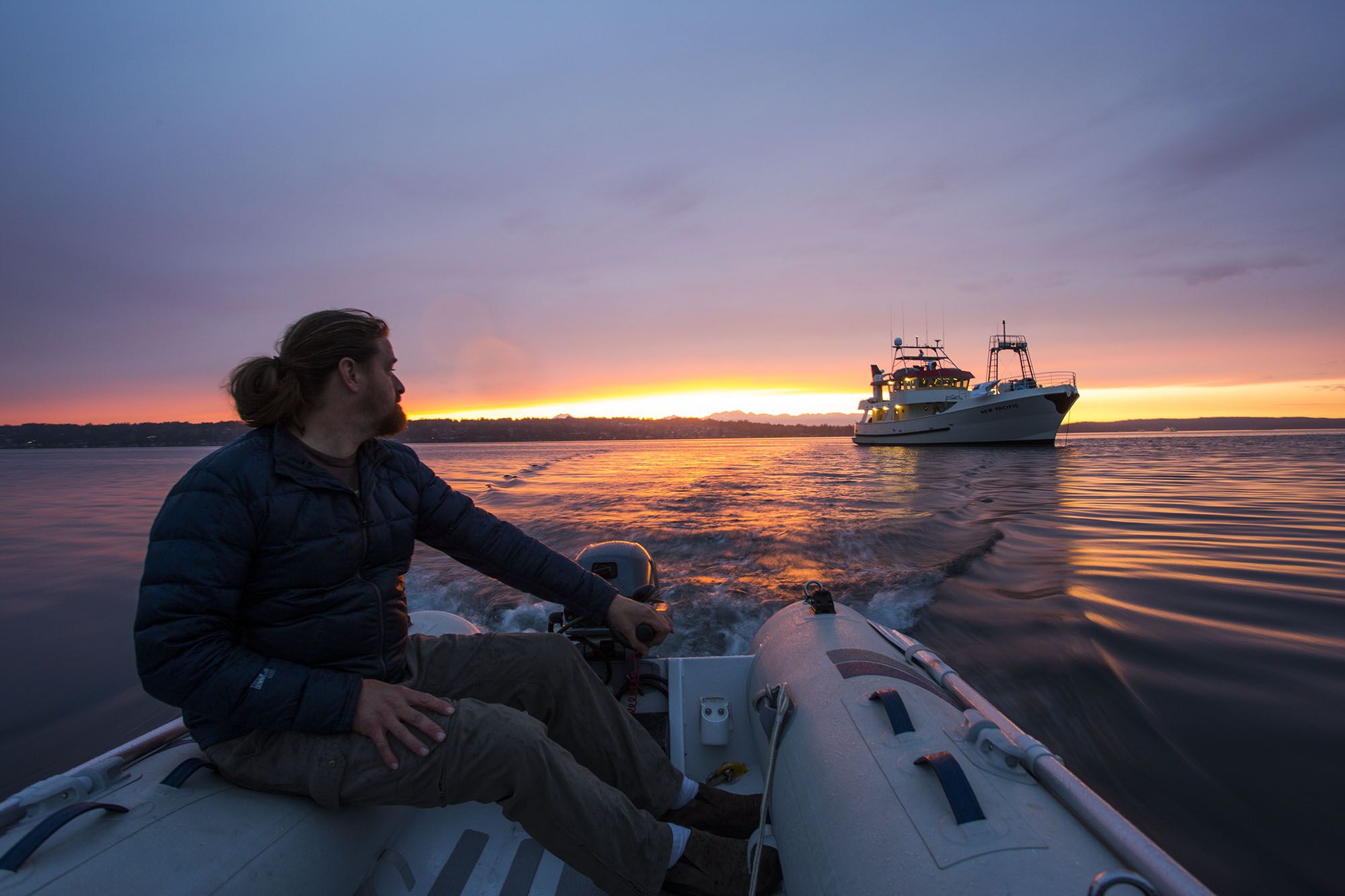 It’s a foggy and still November day in Port Townsend, Washington, and a childhood friend is taking me and my colleague Brian for a quick spin on his 58-foot schooner, Singawing. Matthew Mortensen is his name. He and his wife, Andrea, operate Great Bear Charters, bringing clients up and down the Inside Passage on their flotilla of one. It’s easy to picture spending a week or more on this charter boat bedecked with all the cruising necessities. Its cozy interior has plentiful sleeping quarters and kayaks flare out on racks above the transom.