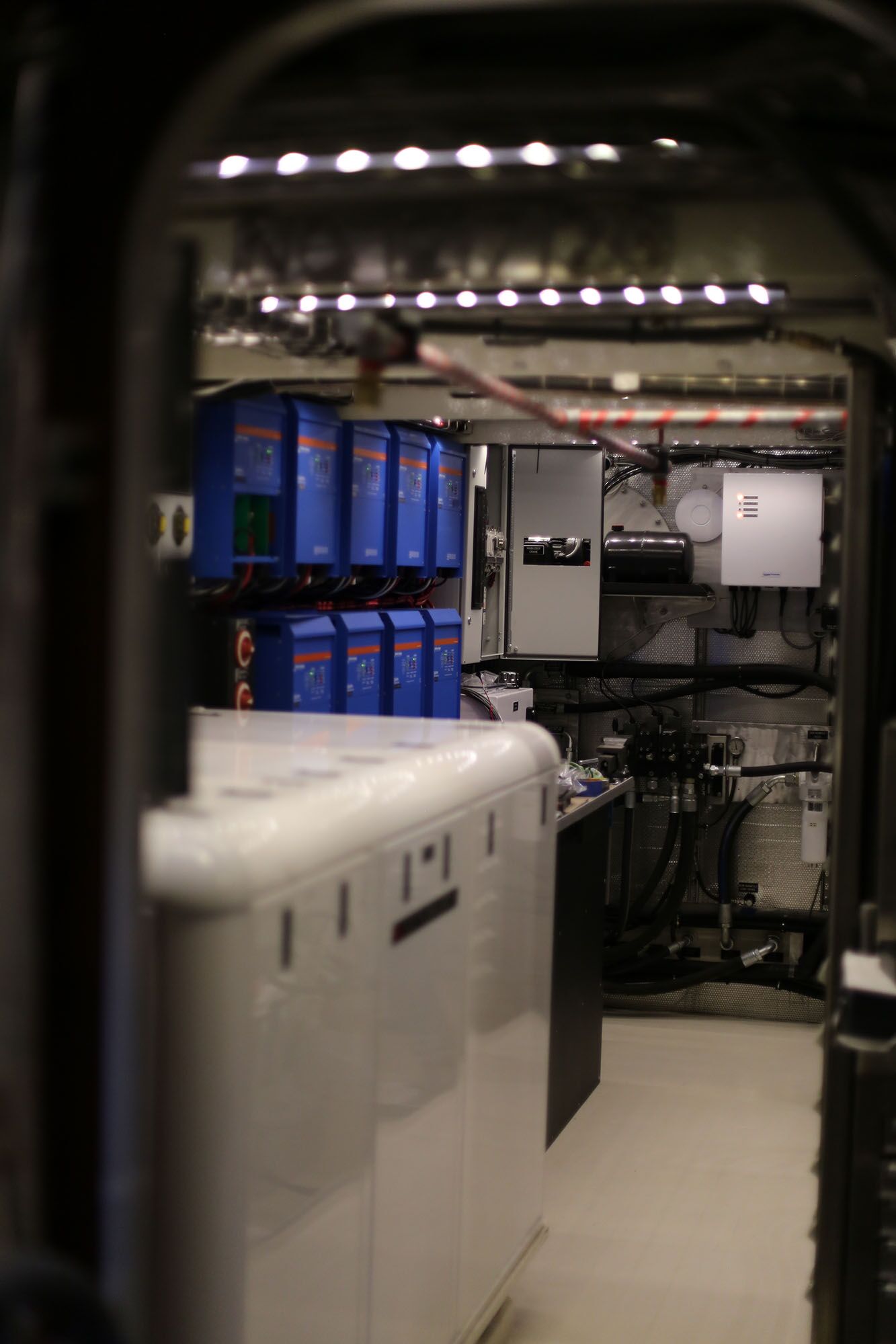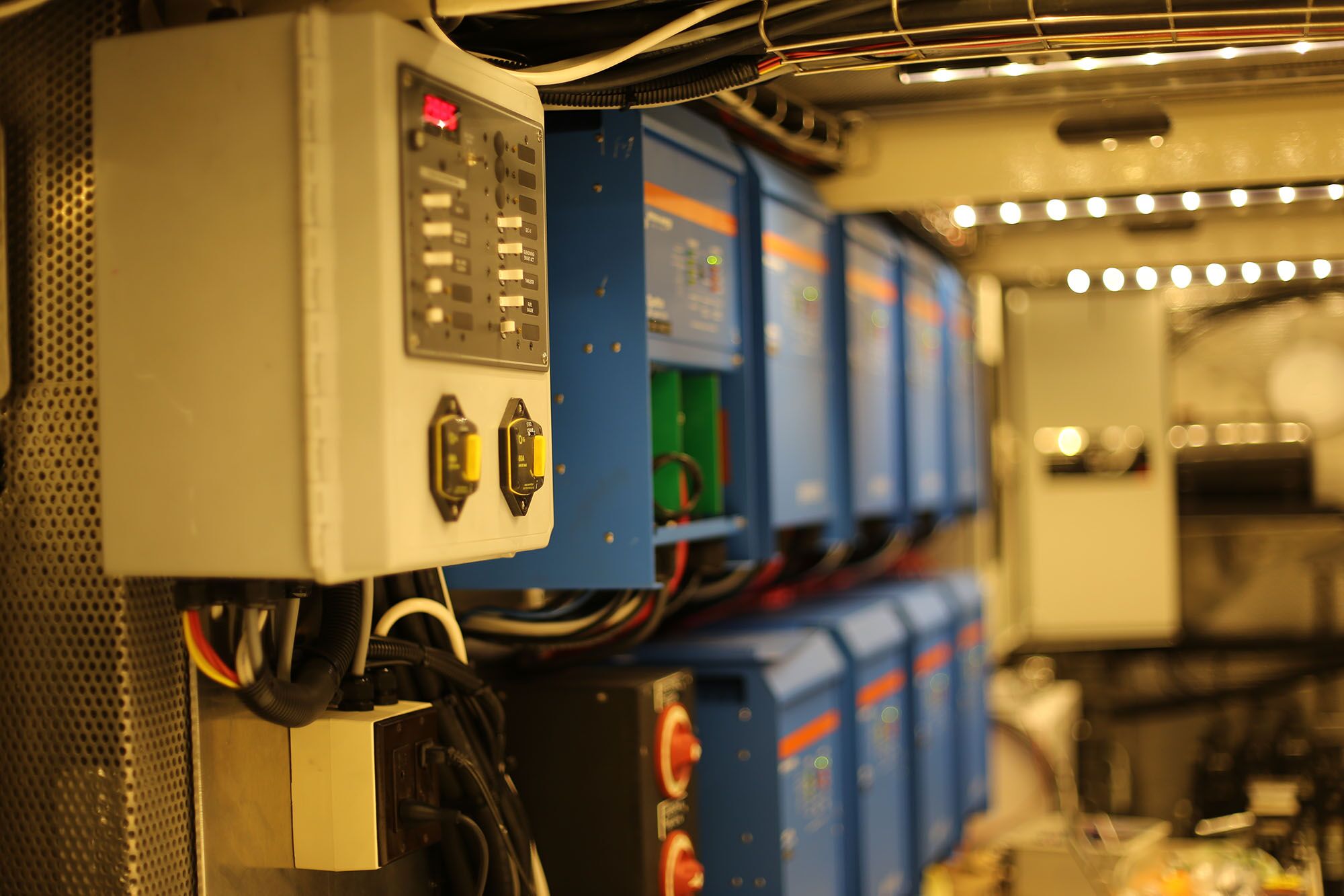 After the first cruise on New Pacific, Jason brought his concerns to ReVision, and the team devised a plan to convert New Pacific into a hybrid-energy powerhouse. The company’s answer was a newly designed LSP house bank, which would handle the load of the entire ship and provide virtually shorepower-free cruising. New Pacific’s engine room offered just enough space to store the required number of batteries. The installation of 10 ReVision ESM 48-115 batteries, with 320 cells providing a 70 kWh energy storage capacity, took three months to complete.