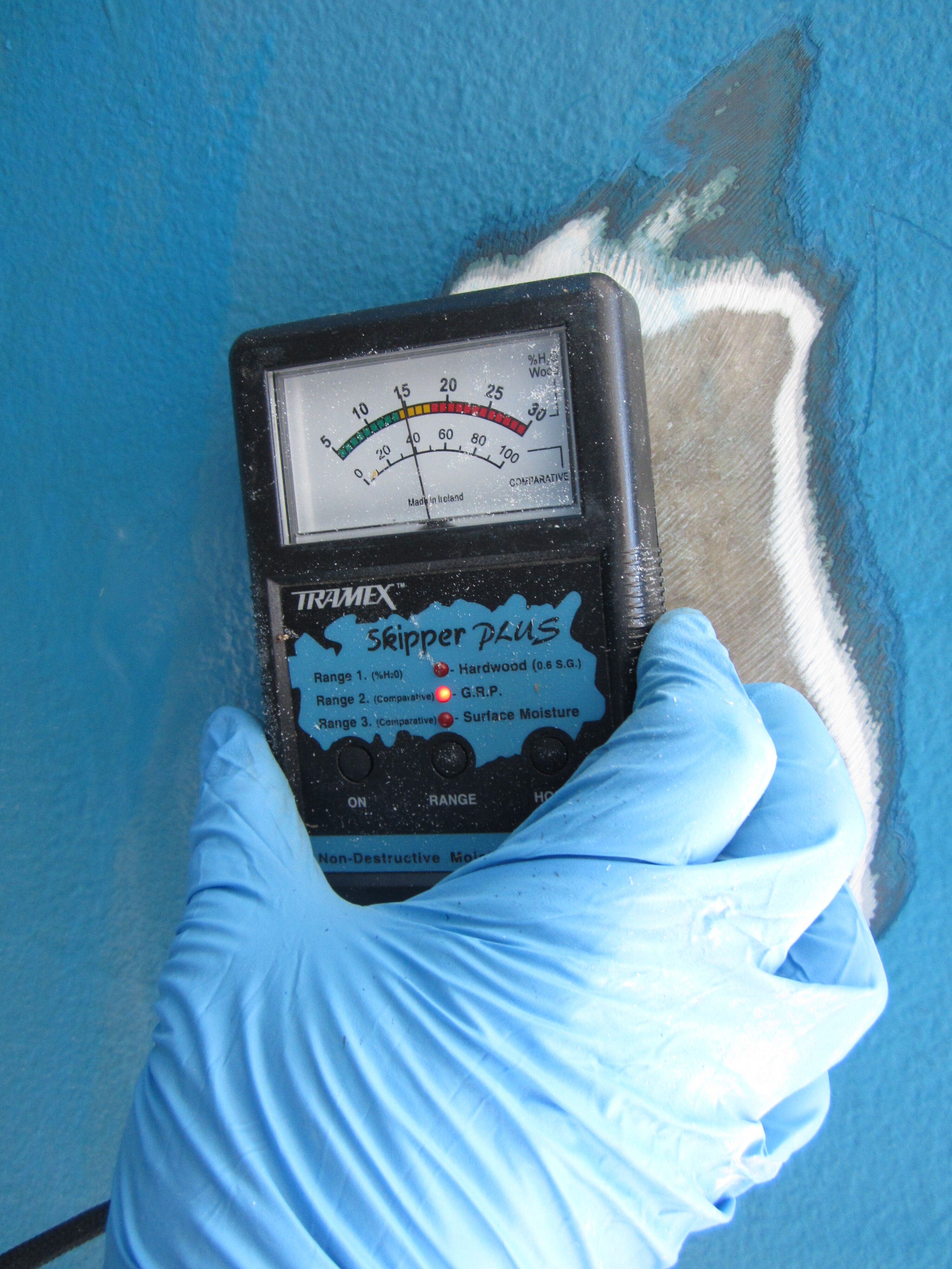 Most often the boat will be hauled the day of the survey. The bottom paint will retain enough moisture to render the meter useless below the waterline. If the boat has been out of the water for a week or more, the meter will tell us if moisture has soaked into the laminate, but will not answer the critical question of depth.