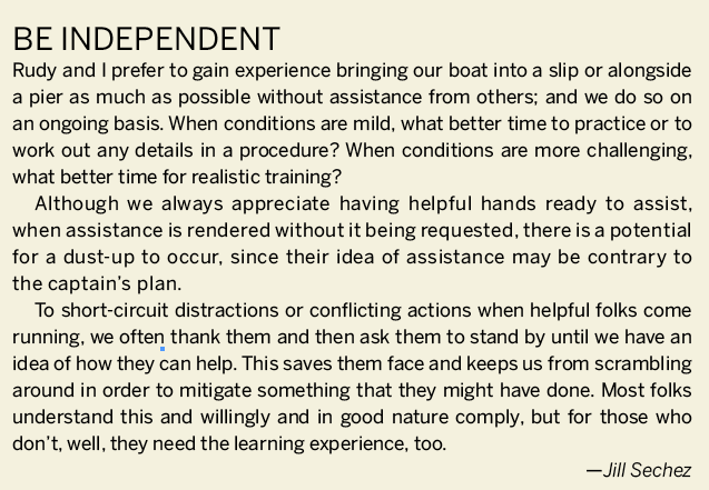 We’ve also had foul-ups when commands from someone other than the captain were followed—sometimes a crew member, other times from the dock committee. Nowadays, we designate one person as the captain, and the crew is informed to obey only that person’s commands. There’s a little leeway in following this procedure, especially if action needs to be taken before there is time to notify the captain of the situation, but unless extenuating circumstances exist, we follow this rule on our boat.