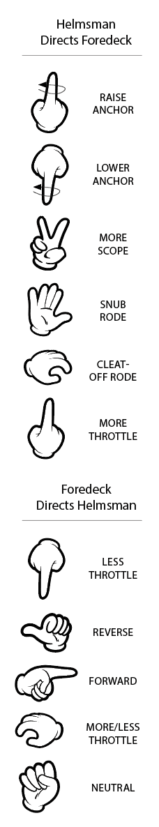 Explain to your crewmembers what’s expected of them while assigning duties and deck positions. Establish a few simple hand signals (see illustration) so that the helmsman and the anchor handler can communicate without shouting back and forth. Depending on who’s calling the shots, the helmsman may need to express commands to “let go (or retrieve) the anchor,” “feed out more scope” and “snub or cleat off the rode.” The anchor handler needs signals to request forward, neutral and reverse gears, and more or less engine throttle. One husband–wife team I know even has a signal for “calm down, dear.”