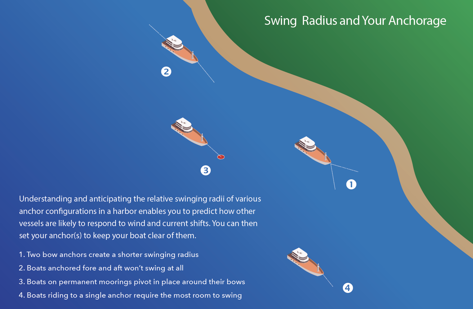 When the wind or current shifts, these boats will all respond differently. The vessel with two bow anchors set will swing in a shorter radius than boats on a single hook. Vessels anchored fore and aft won’t swing at all. Those on permanent moorings will pivot around their bows, but otherwise move very little. In light airs, boats with all-chain rodes may not swing as far or as quickly as those riding to a mostly nylon rode.