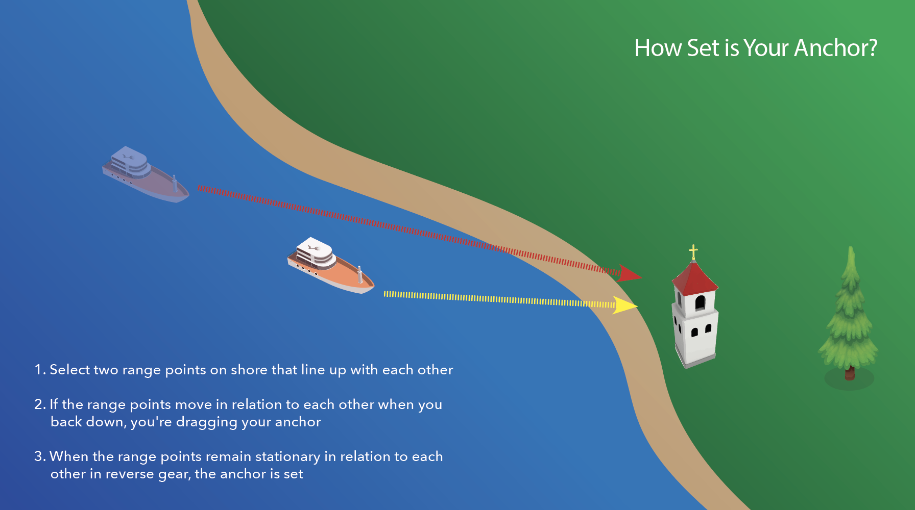Select a range abeam of you, two stationary objects preferably on shore, one father away than the other but more or less lined up with each other, such as a dock piling with a building beyond, a prominent rock and a tree, or whatever’s handy. With the engine in reverse, raise the throttle a few hundred rpm above idle. Keep your eyes on the range abeam. You’ll see by its movement that the boat is beginning to make sternway as the rode stretches out. If the anchor is truly set, you will then feel the boat come to an abrupt halt when the rode becomes taught. The range points will verify this by ceasing to move in relation to each other.