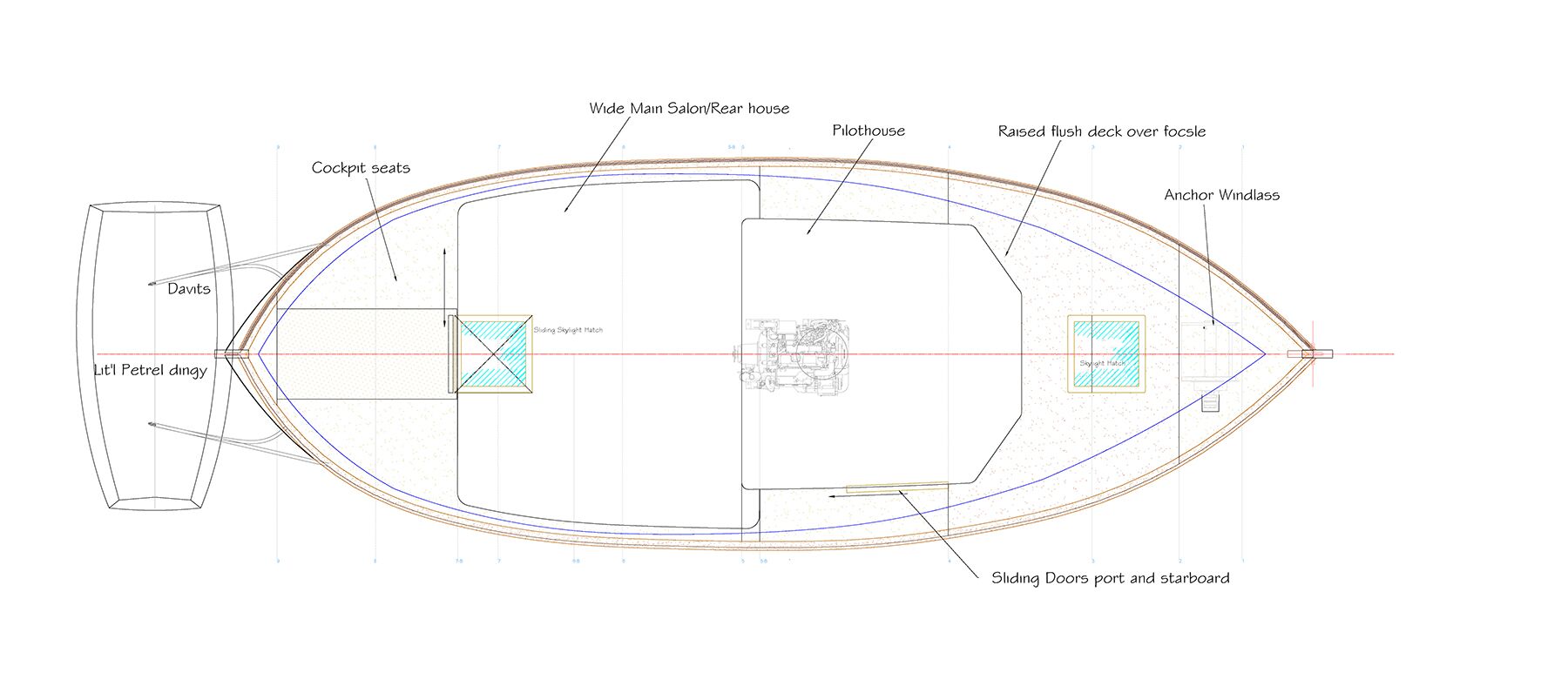 I increased the width of the rear house to stretch almost from sheer to sheer, with the walk-up side deck eliminated in favor of moving forward and aft within the house itself. There is still a 7-inch side deck alongside this wider cabin, but I would only need to work this area to set a fender, and the truth is that it could be rigged from aft or forward and flipped over the side at the last minute.