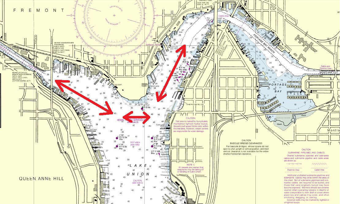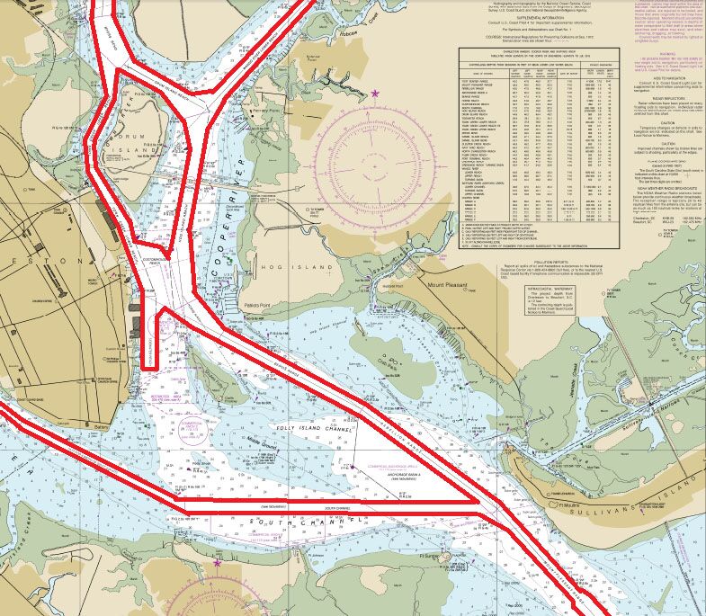Below is one example of a fairway, where two narrow dredged channels are connected by a large, deep lake. The fairway is not mentioned on the chart; you just have to intuit where ships might navigate between one channel and the other. Once you realize that you might be in a fairway, you must assume that Rule 9 applies and avoid impeding the vessels utilizing the fairway.