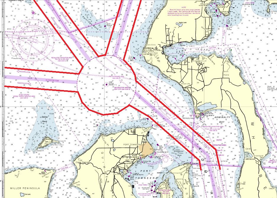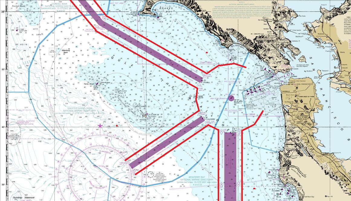 A TSS may be offshore or inland, as illustrated above. Vessels greater than 66 feet are obligated to follow the TSS; smaller vessels are not, however, and are instead permitted to use the inshore traffic zone, which is the area between the TSS and the shoreline. If, for whatever reason, a small boat needs to use the TSS, then like all other traffic it must proceed in the correct lane (inbound or outbound) and may not impede the passage of other vessels following the traffic lane. Fishing vessels and sailing vessels of any size are similarly required to not impede the passage of vessels following the traffic lanes. Fishing vessels, however, are allowed to fish within the traffic separation zone (the “median” or, as it appears on the chart, “the purple part”) so long as their nets, lines, pots, and other gear do not extend into the traffic lanes.