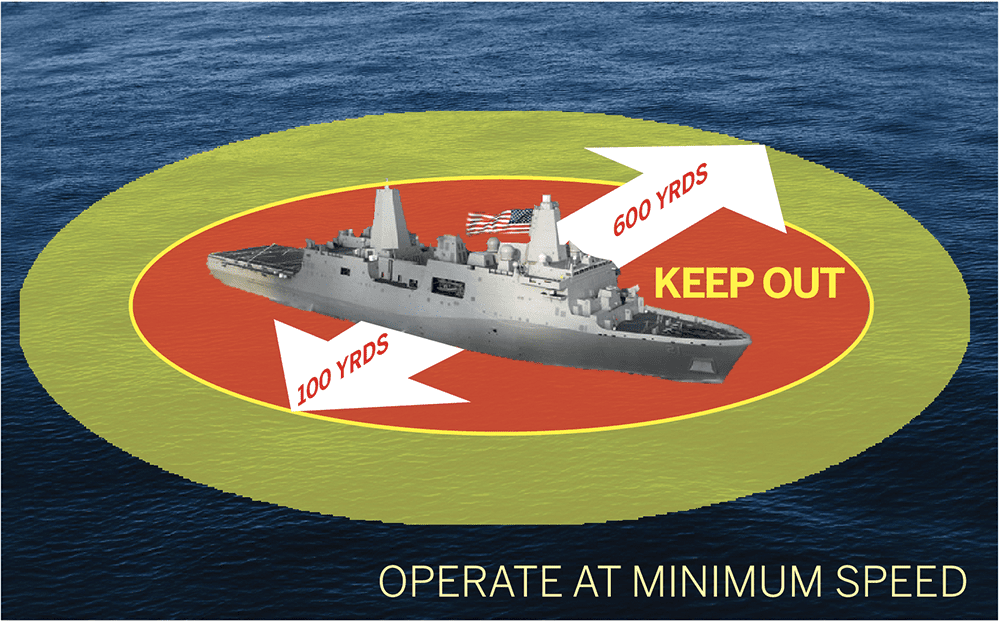 In addition to all of this, any U.S. military vessel operating in U.S. waters has a legally defined “naval vessel protection zone” surrounding it, whether underway, at anchor, or moored. It is a felony offense to operate a vessel within this zone, which extends 100 yards around the vessel in all directions. In addition, you must slow to bare steerageway (the absolute minimum speed at which water moving over your rudder will allow you to turn properly) when within 500 yards of the naval vessel. This is to say that no matter what the naval ship is doing, you must maintain a minimum closest point of approach (CPA) of one-quarter nautical mile, and if you have the water to do so, you probably want to extend that to one-half nautical mile or more. The penalty for violating this rule is up to six years in prison and/or $250,000 in fines—and by all accounts they have very little sense of humor about this.