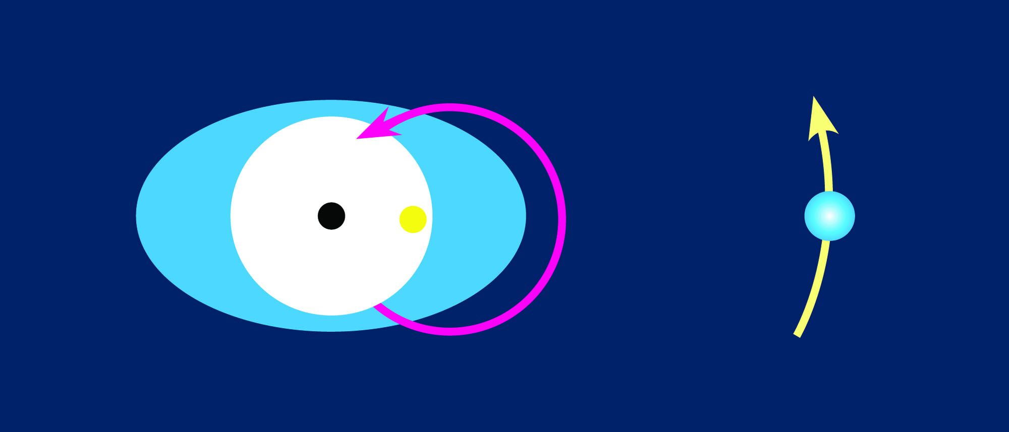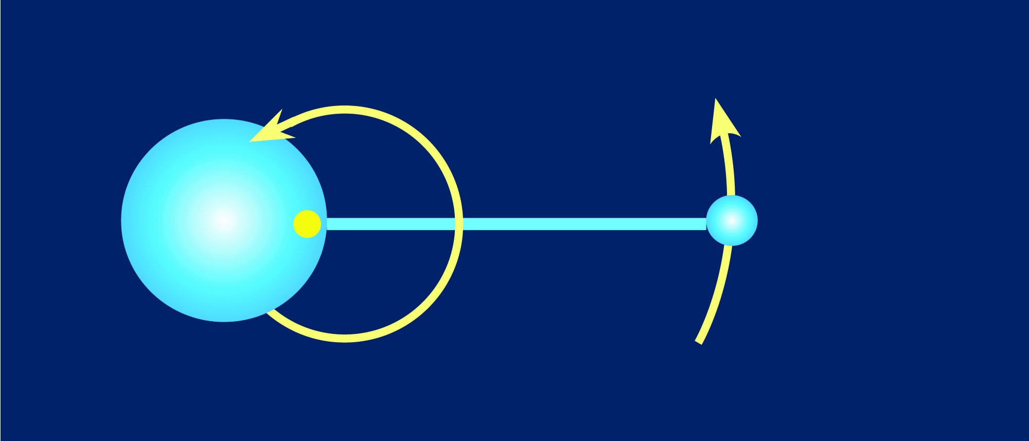 Now, if I make one of the iron balls really small, say one-quarter of the diameter of the larger ball, then in order to balance the barbell, I would actually need to move the fulcrum inside the larger ball, if that were possible. But if I were able to do that and once again throw the barbell so that it tumbled, the smaller ball would make a very large circle around the barycenter. And because the barycenter would actually be somewhat inside the larger ball, the center of gravity of the larger ball would wobble around the barycenter, in the direction opposite the smaller ball (Figure 2).