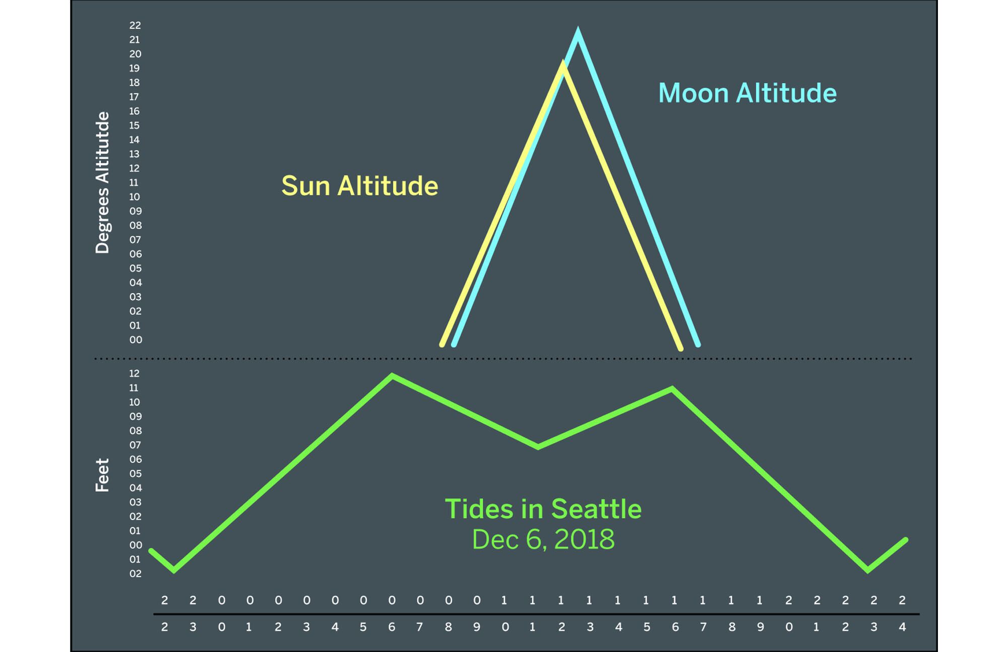 Here we see Seattle (right), on the day of the new moon, when the sun and moon are close enough to each other in the sky (as seen from the earth) to be gravitationally considered a single object.