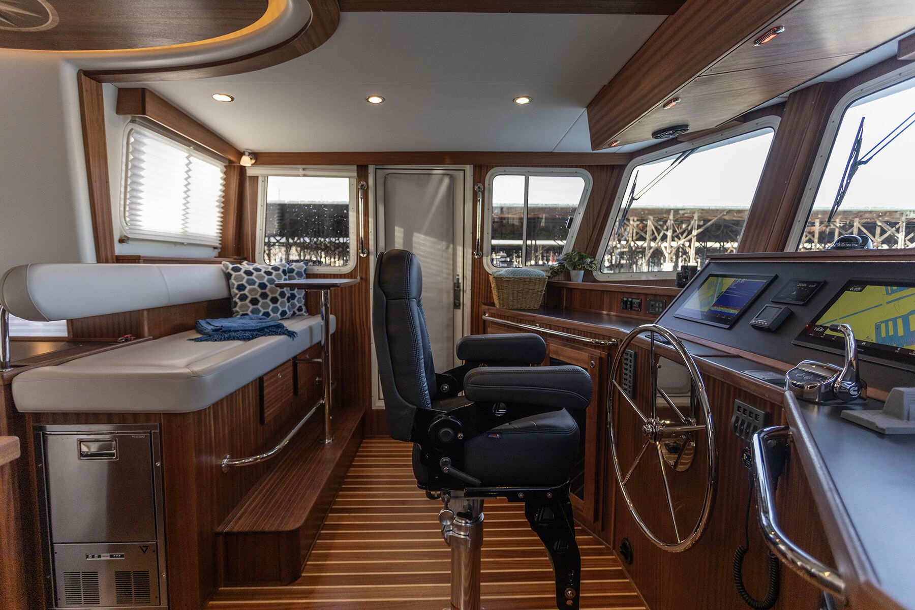 That culture has been hard-earned. Senour died in the mid-2000s after helping to develop the 435 model. After that, the company developed the 395 and 485, in addition to two prototypes called the 49 Limited Edition. “We did a 395 twin-engine boat, the only twin-engine American Tug ever to exist. All the rest are single-engine,” Dilworth says. “The 34 became the 365. It’s just a name change. It was a single-stateroom boat, and in 2020, we introduced our 362, which is exactly the same as the original hull we introduced in 2000 except it has two staterooms.”