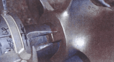 If the pressure on the propeller blade is lowered enough-because the blade is overloaded, turning too fast, or damaged-the boiling point of the water may be reached. When this occurs, vapor, or partial- vacuum bubbles, form on the blade surface. Although this lowers efficiency of the blade by causing uneven pressure, the bubbles don’t cause any trouble until they collapse, typically when they reach an area on the blade where pressure increases or returns to normal. Then, each bubble collapses or implodes violently, taking with it a few molecules of metal.