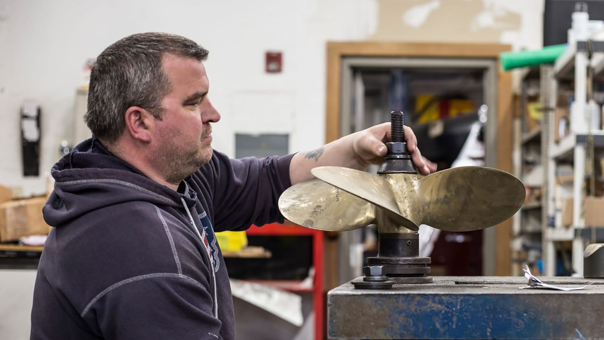 How do you know when it’s time to check your prop? Even if you haven’t hit anything and your engine is turning its full RPM, Hale suggests doing so every couple of years. If your revs are down, first make sure it’s not an engine issue; have a mechanic check things out. If all’s copacetic under the hood, it could be time to look at the prop. But before pulling the boat, make a number of trial runs, noting speed, revs, fuel burn, temperature—anything you can measure. Get as accurate a weight estimate as you can, including typical fuel and freshwater levels.