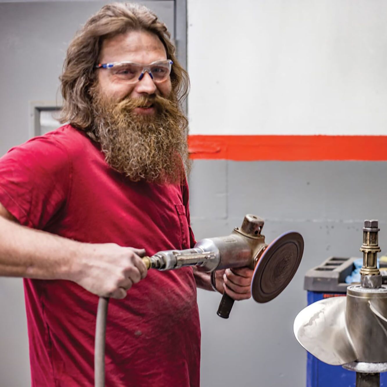 Hale dynamic-balances every prop after repair; he says that static balancing works most of the time, but dynamic works all the time. The balancing machine looks sort of like a lathe, but there’s a honkin’ big prop spinning on it; the overhead shop lights make the blades flash as they rotate. Sensors detect any imbalance in the blades and then send the data to a computer, which determines where, and how much, metal has to be removed to balance the prop. It’s removed with a grinder, and here’s another instance where art trumps science: After 25 years in the shop, Hale knows just how much grinding it’ll take to bring things back into harmony. Not something a computer could do.
