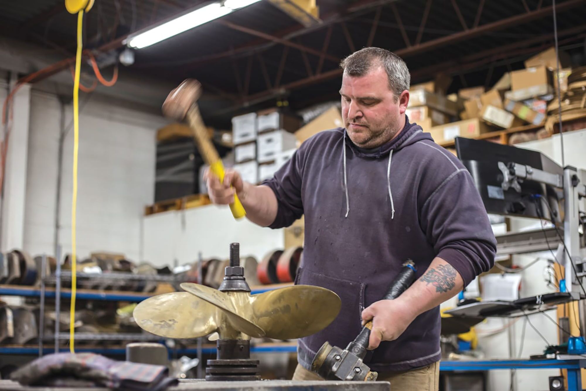 Pay a visit to Hale Propellers, like I did recently, and you’ll see plenty of tools—hammers, grinders and pitch blocks—along with the computerized gear, and a bunch of workers who know how to use both high- and low-tech. There are propellers everywhere, from stainless-steel outboard props to fishing-trawler props to pod-drive contra-rotating props with razor-thin blades. Some of them looked to me like candidates for recycling, but Hale said they all could be repaired. “If you have all the pieces, almost any prop can be fixed.”