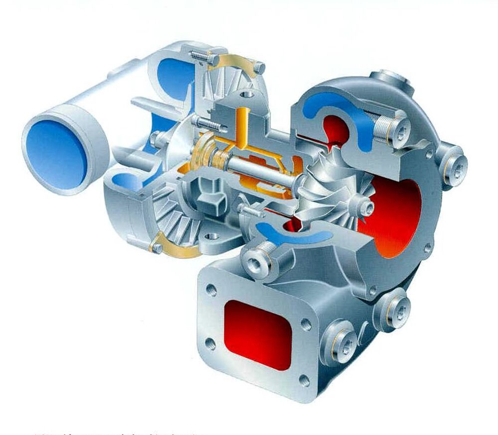 Courtesy: Borg Warner TurboSystemsThe cast housing of your turbocharger contains the following main components: a turbine wheel, a compressor wheel, and an axle to connect the two wheels. Oil from the engine lubricates these parts, and coolant from the engine helps remove heat from the housing.