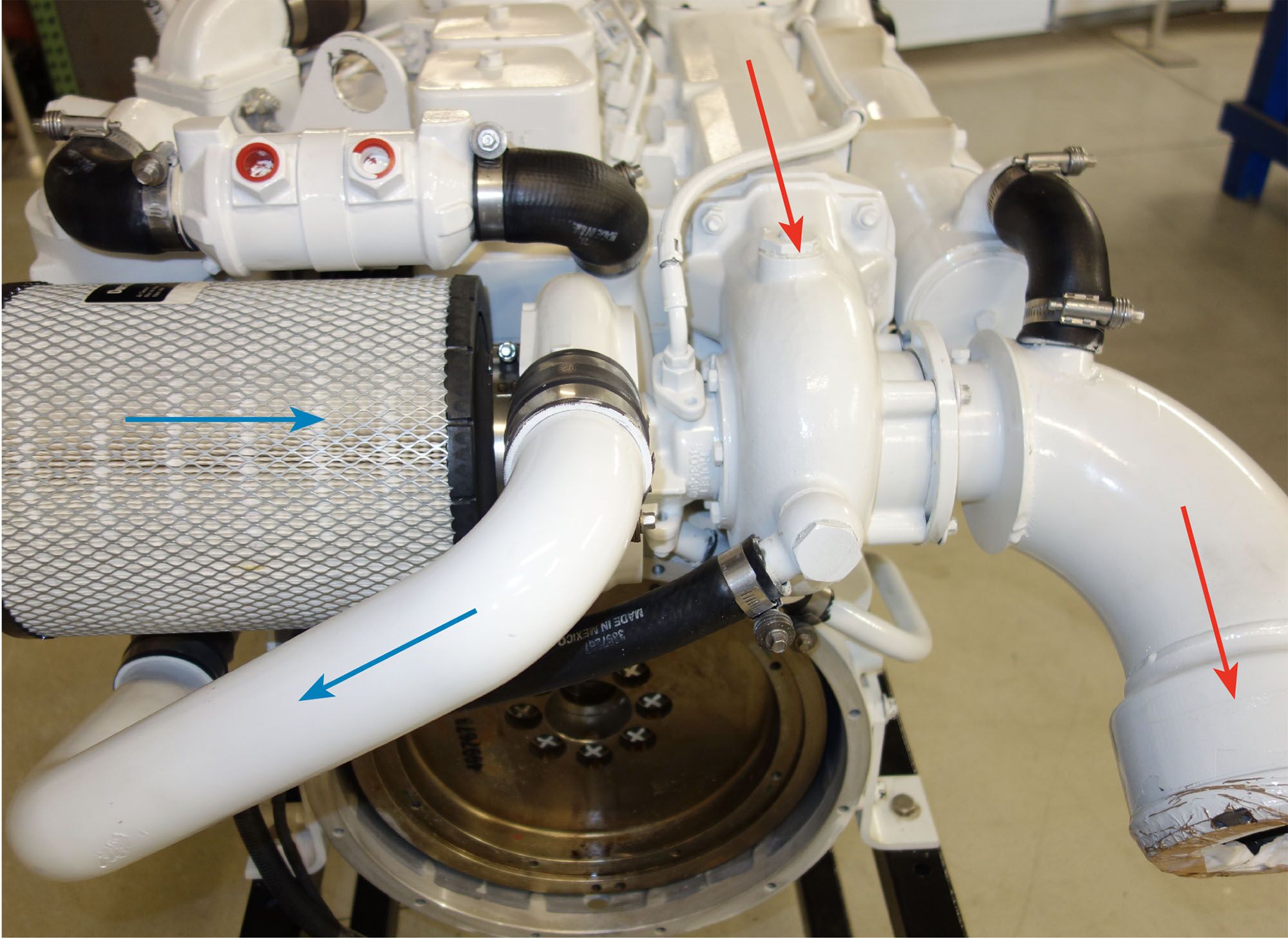 Converting the waste energy from the exhaust gas into compressed air for the engine’s intake creates its own problem, however. Compressing the air causes it to heat up, and remember that when a gas heats up, it contains less oxygen. This means less energy is going to the engine, which counteracts the benefit of the turbocharger. This is why the system also includes some type of air cooler (either an intercooler or an after cooler, depending on the configuration). This heat exchanger is designed to reduce the temperature of the compressed air before it enters the cylinders. In most cases this exchange of heat uses circulating seawater to cool the air (see PassageMaker, April 2017).