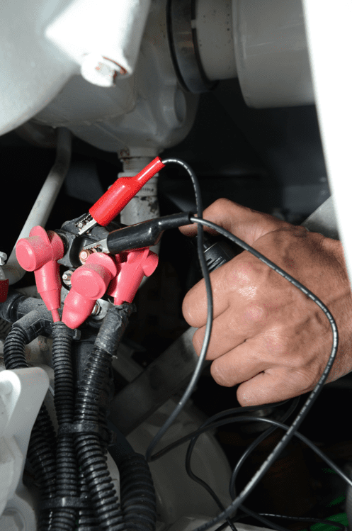 Most marine diesel engines utilize two solenoids. The starter solenoid will be attached to the starter. If you follow the control wires coming to the starter solenoid, you will soon locate the slave solenoid. In our experience the slave solenoids fail more often that the starter solenoids. You should begin the troubleshooting process at the slave solenoid, and the procedures described above apply, with one important exception: Instead of connecting two wires on one of the larger studs, use a pair of heavy-duty jumper cables to make a temporary connection between the two large terminals. This difference is important, because as soon as the engine starts, you will have to remove the jumper cables quickly. Also remember that the ignition switch must be on.