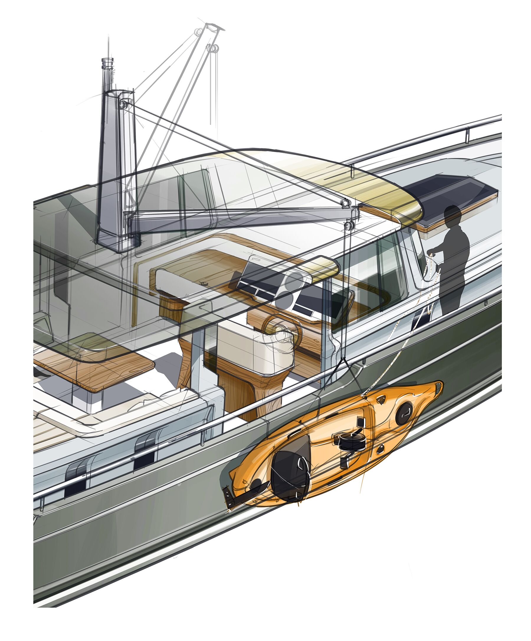 It was imperative to keep some other design elements that defined the original vessels, namely the life buoy and mast. Now, the mast functions as a central winch to lift kayaks, e-bikes or other water toys to the hardtop.