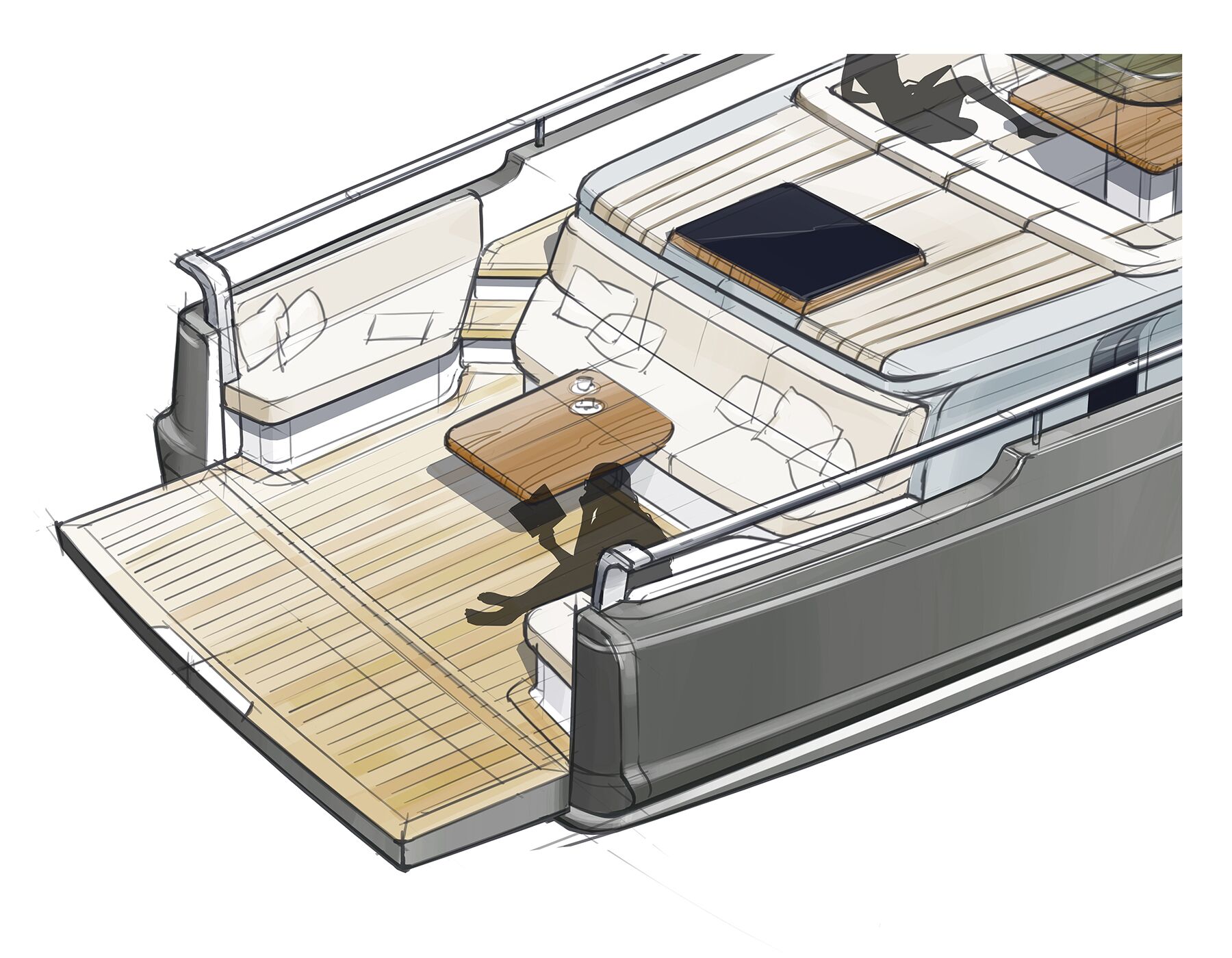 We retained her classic profile with a windowed pilothouse, a coachroof and a beefy rubrail that stretches over the full length (it also functions as a spray rail). We added a swim platform and a transom that drops like a truck’s tailgate. It allows for egress to and from the brine, and eases ferrying loads on and off. The mini-beach club has a removable table and a trio of settees, including a rear-facing seat that demarcates the area from the cockpit. I can also envision fitting the swim stem with chocks to accommodate a small, outboard-powered dinghy.