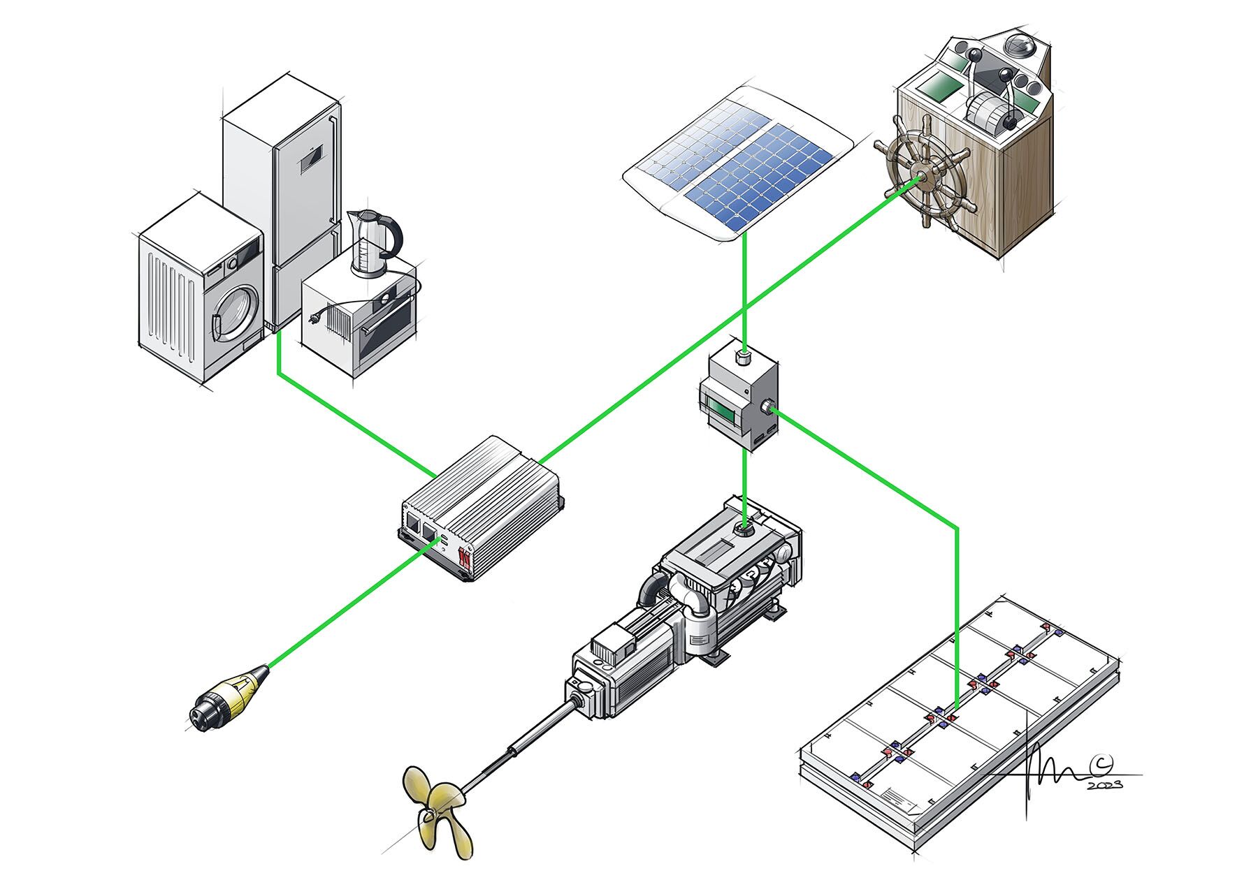 The Docker will be powered by a single 140-hp diesel that should return an economical performance from an 8-knot cruise to her top end of 12 knots (more speed can be had with a larger power plant). We also added a 15-kW electric motor, driven by a solar array and a lithium battery bank, for short passages and marina maneuvers.