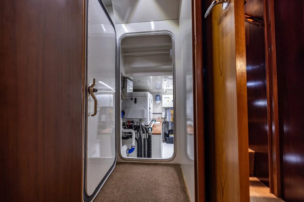 Power is provided by a set of Kohler generators: a 380-volt primary with 17.5 kW, and a secondary 230-volt with 6.5 kW. They’re connected to Mastervolt inverters. All the electricity on board is supplied by lithium-ion batteries, with the generators solely responsible for the charging.