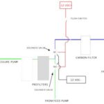 N. Flushing and Rejection Circuits: In addition to a mechanism to detect and reject overly saline product water, I need a way to flush the system with fresh water after each use. Doing so helps clean the membrane of biological material and removes salt water from the system, greatly increasing the life of all components. A simple solution is to install a three-way valve in the raw water intake line so that fresh water can be drawn through the system from a 5-gallon bucket. I chose to use solenoid valves, which close the raw water intake line, and open a line plumbed to the boat’s pressurized freshwater system. A word of caution: the RO membranes are intolerant of free chlorine—less than 0.01 ppm is allowed. To be safe, I routed the flush water through a carbon filter to remove any residual chlorine before it hits the membrane.