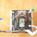 In Figure 12, the high-pressure brine water enters the pressure regulator (the needle valve centered at the bottom) via the black hose (lower left). Its pressure is measured via the second black hose by the gage (top center). The brine water exits the regulator at low pressure, then enters the raw water flow gage via the white Watts Quick-Connect fittings (bottom right). Then, the brine water exits overboard via the green fitting (top right). Product water enters its flow gage via the blue fitting (center left) and exits to the tank via the yellow fitting (top left). Its salinity is measured by the meter (the white rectangle in the center) via an electrode (not shown) in the hose after the yellow fitting.