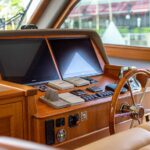The bridge is accessed via a teak stairway from the cockpit, which houses the 10′ outboard-mounted tender on a custom cradle, with 1,000lb davit for easy launching and retrieval. The bridge helm further improves navigational sightlines from the already well-appointed lower helm and is complimented by twin Stidd captains chairs to your spec, and can be outfitted with your chosen navigational equipment.