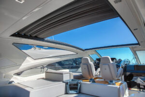 Within the Sport 420’s generous, 8’ 11” beam lie a wealth of amenities designed to enhance time on the water for you and up to seven passengers. The European-inspired interior styling includes double diamond-stitch cushions with carbon fabric upholstery for a luxury look and feel. There are three comfortable seats, including a deep, full-width rear seat that allows a passenger to sit beside the driver. The helm console incorporates a tinted windscreen, ergonomic steering wheel and grabrail, and has room for a 7-inch chartplotter. A sporty carbon fiber dash is optional.