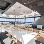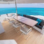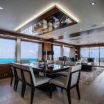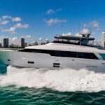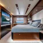 Breakthrough design ushers in a breathtaking experience aboard the Hatteras M90. The latest model to enter the Hatteras fleet, this stunning open-concept features a crisp, light-filled interior that strikes a perfect balance of dramatic form and ingenious function. The M90 incorporates an inspiring range of global design influences to create new uses of living, dining and entertaining spaces. Distinctive features include signature skylights as well as a sweeping staircase to the expansive bridge. An amazing play is created between the interior and exterior spaces, which include a modular bar on the aft deck and ample lounging space on the side decks and bow. The impact of the massive 22’6″ beam is felt throughout, including in the four luxurious staterooms.