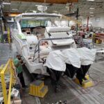 A full-width hardtop with a top-to-bottom windshield and exclusive sliding bow window to port allows for an open, inviting cockpit experience. The fiberglass hardtop with full-width motorized glass sunroof opens to the sky, while interconnected SmartZone™ seating, from the expansive bow to triple helm seating and U-shaped lounge aft, increases choice for all. The cockpit environment is yours to control with available 18,000 BTU reverse cycle air conditioner and standard Rockford Fosgate® stereo with USB port, Bluetooth® and ten JL Audio® blue LED lighted chrome-finished speakers with 600W amplification and lighted 200W subwoofer.