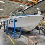 To port, the large pullout Isotherm stainless steel refrigerator, additional drawer storage plus a slide-out drawer and shelf unit allow for comfortable stay-aboard journeys. Also to port is the electronics pylon with Rockford Fosgate stereo remote control, touch air conditioning control and light switches. Digital switching offers chartplotter connectivity and light dimming control. Four cabin speakers bring pure audio clarity while blue LED accent lighting acts as a dramatic design element throughout.