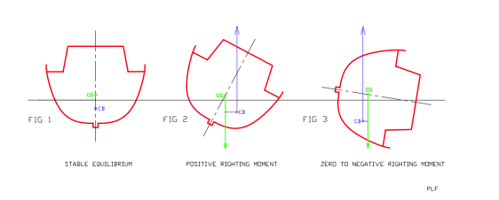 However, as shown in Figure 3 of the top image, if external forces continue to heel the vessel further, there comes a point at which the relative positions of the CG and CB reverse, with the result that the force couple formed works not to right the vessel, but to capsize her.